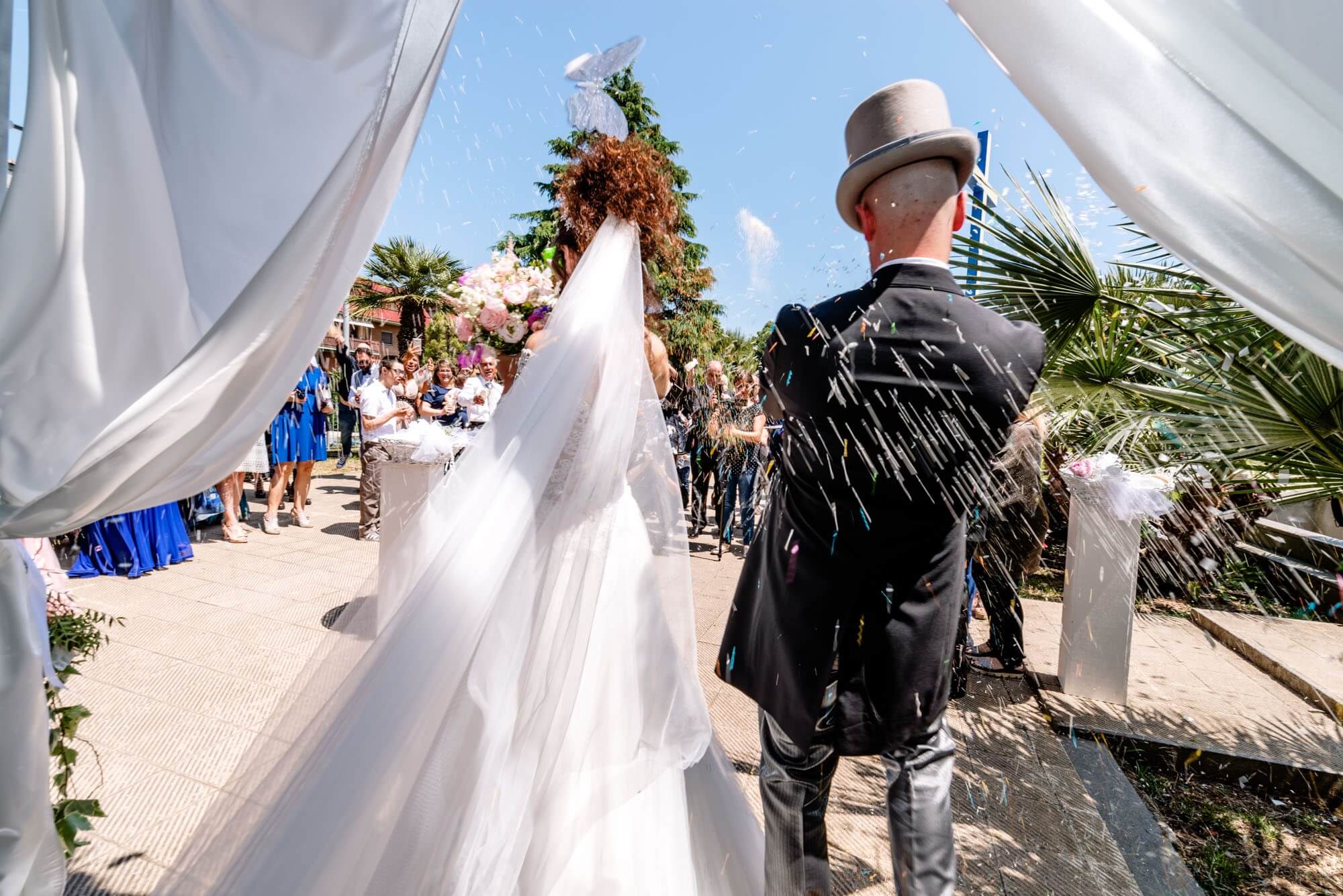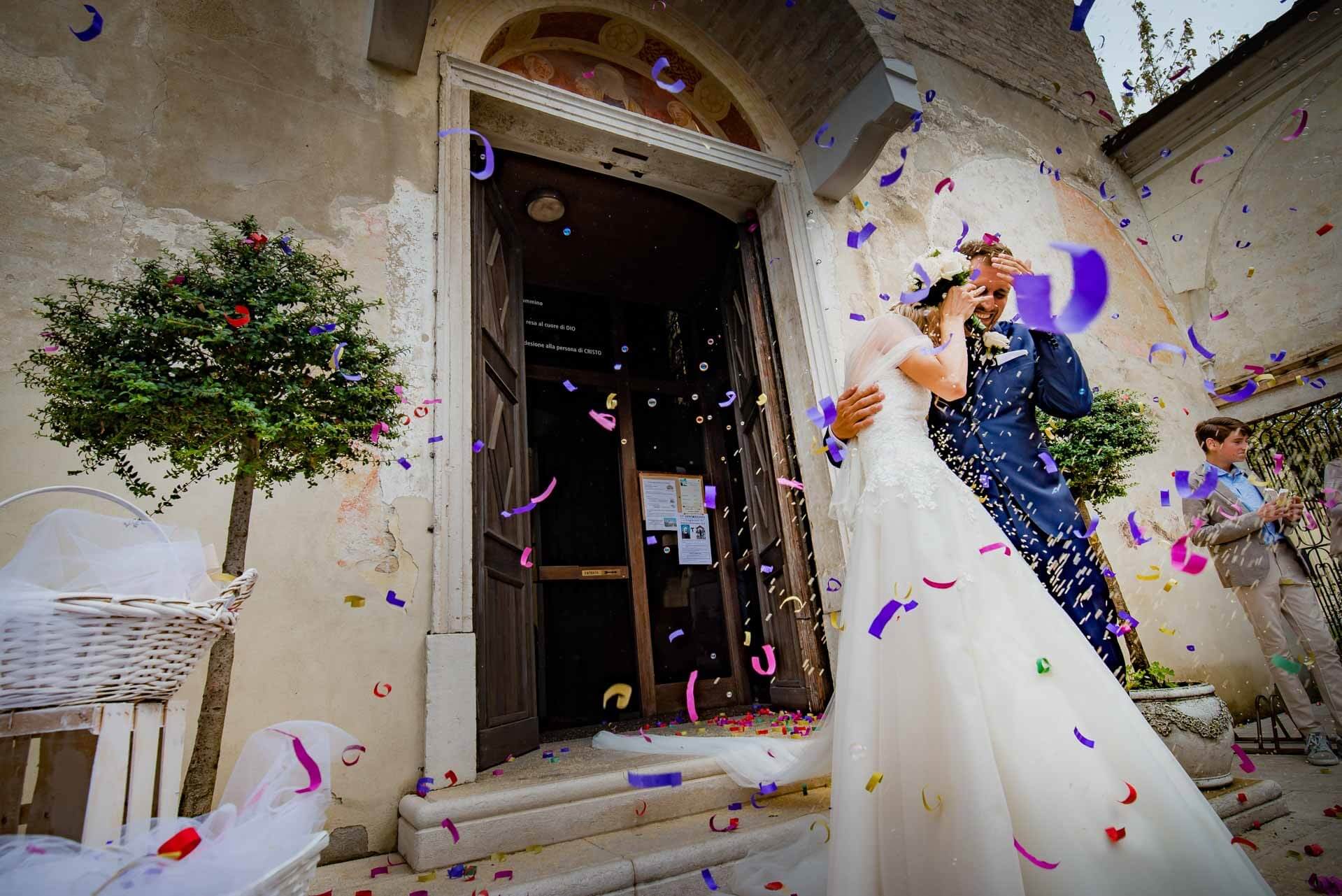 Quando fotografo questo momento, nei pochi secondi disponibili, mimetizzato tra gli invitati, per non rovinare l’atmosfera, cerco immagini che racchiudono la gioia, l’euforia, la partecipazione e la condivisione con gli sposi di un momento unico: l’inizio di una nuova vita, di un nuovo cammino. Non è solo un’esplosione di colori, c’è soprattutto l’intensità del movimento bloccato e gli sposi, finalmente insieme, che tendono a stare vicino ed a stringersi per ripararsi dalla festosa pioggia di riso.