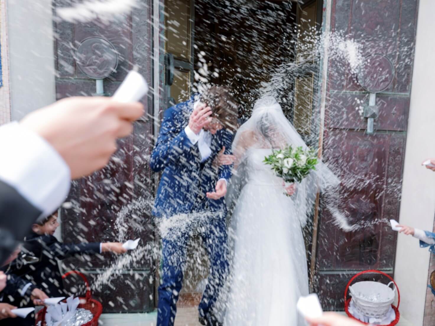 Quando fotografo questo momento, nei pochi secondi disponibili, mimetizzato tra gli invitati, per non rovinare l’atmosfera, cerco immagini che racchiudono la gioia, l’euforia, la partecipazione e la condivisione con gli sposi di un momento unico: l’inizio di una nuova vita, di un nuovo cammino. Non è solo un’esplosione di colori, c’è soprattutto l’intensità del movimento bloccato e gli sposi, finalmente insieme, che tendono a stare vicino ed a stringersi per ripararsi dalla festosa pioggia di riso.